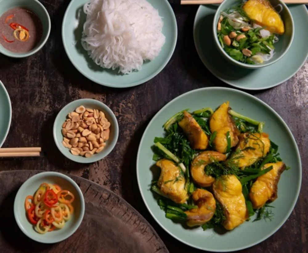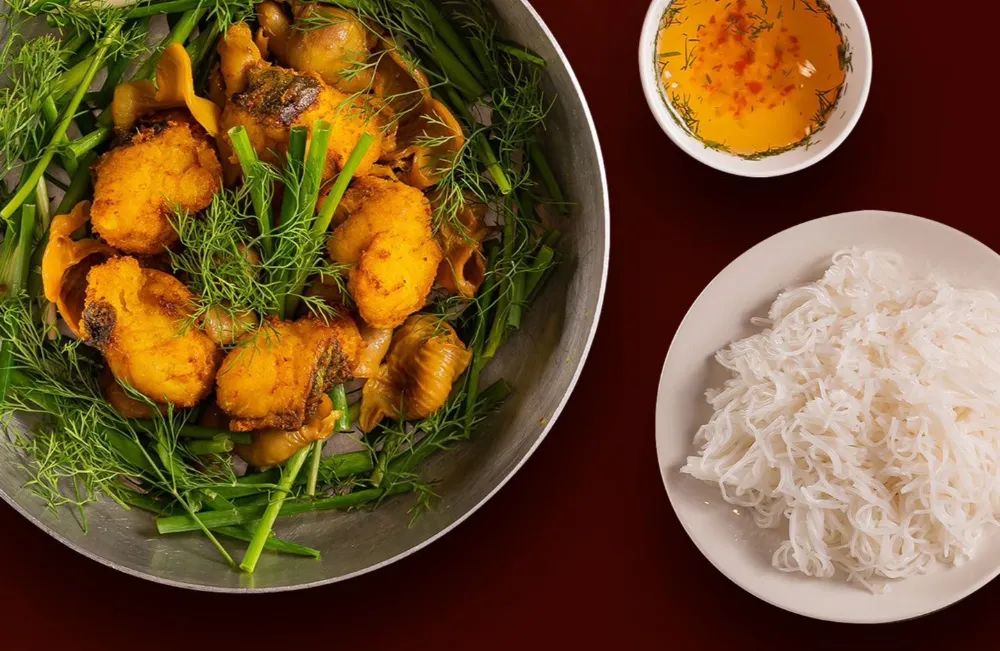 Premium Ingredients: The dish is usually made from Lang fish (Hemibagrus-a type of catfish) known for its sweet, firm meat and few bones. It is carefully marinated with galangal, fermented rice (mẻ), and turmeric to create a beautiful golden color.