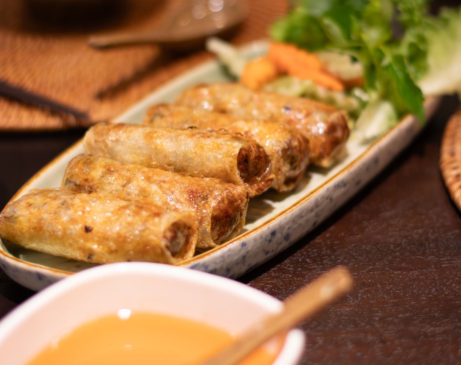 These golden-fried rolls are filled with a flavorful mix of minced pork, wood ear mushrooms, glass noodles, and fragrant herbs — all wrapped tightly and fried until crisp. Served with fresh greens and a side of sweet fish sauce for dipping, they’re a guaranteed crowd favorite. Perfect for sharing, especially with an ice-cold beer in hand.